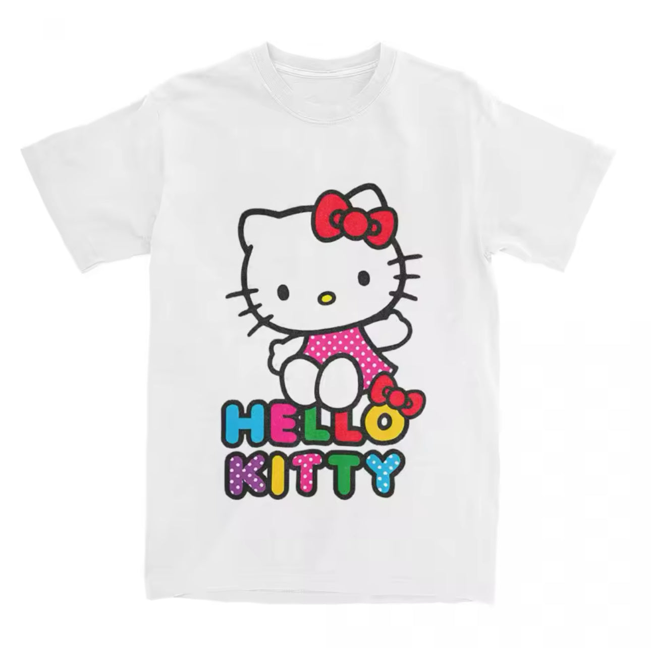 Introducing the Hello Kitty Tee - a fun and playful addition to your wardrobe. Made with high-quality material, this tee features the beloved Hello Kitty character, adding a touch of cuteness to any outfit. Perfect for fans of all ages, this tee brings joy and style to your everyday look.